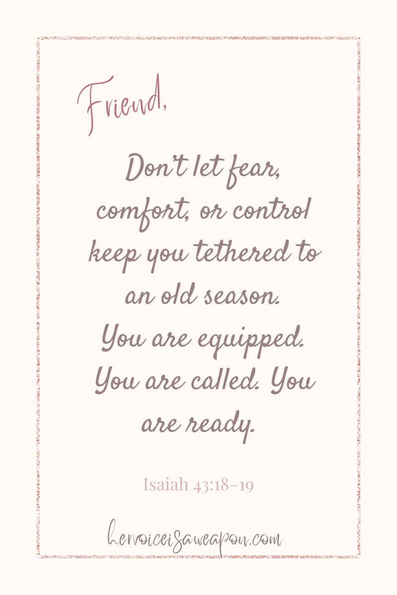 Friend, God is doing a new thing. Don’t let fear, comfort, or control keep you tethered to an old season. You are equipped. You are called. You are ready.