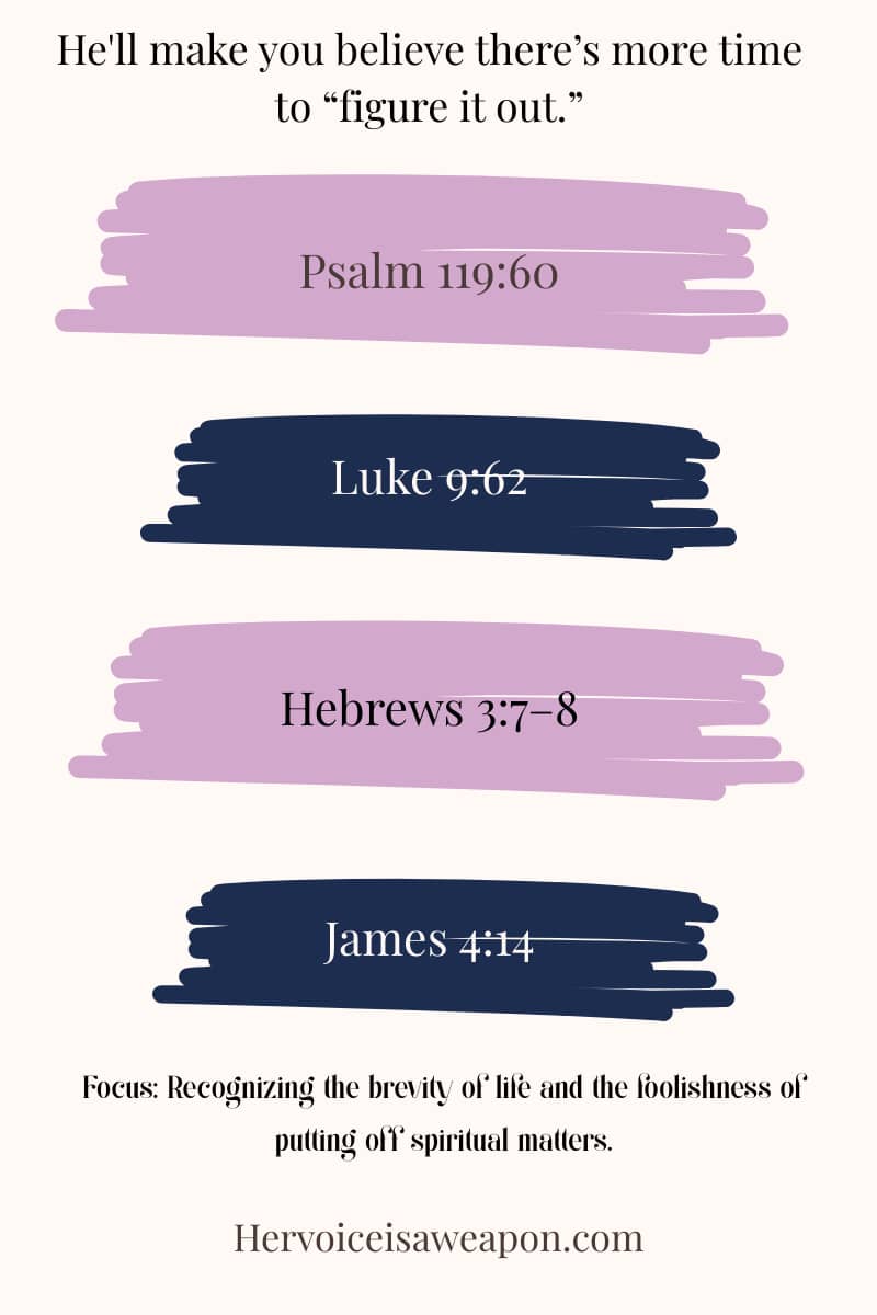 Delay → Convincing you there’s “plenty of time,” so you keep putting off obedience.