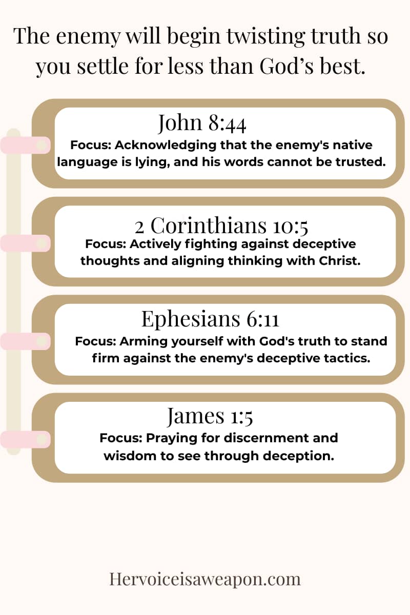 Deception → Whispering lies that twist God’s truth and make you settle for less.