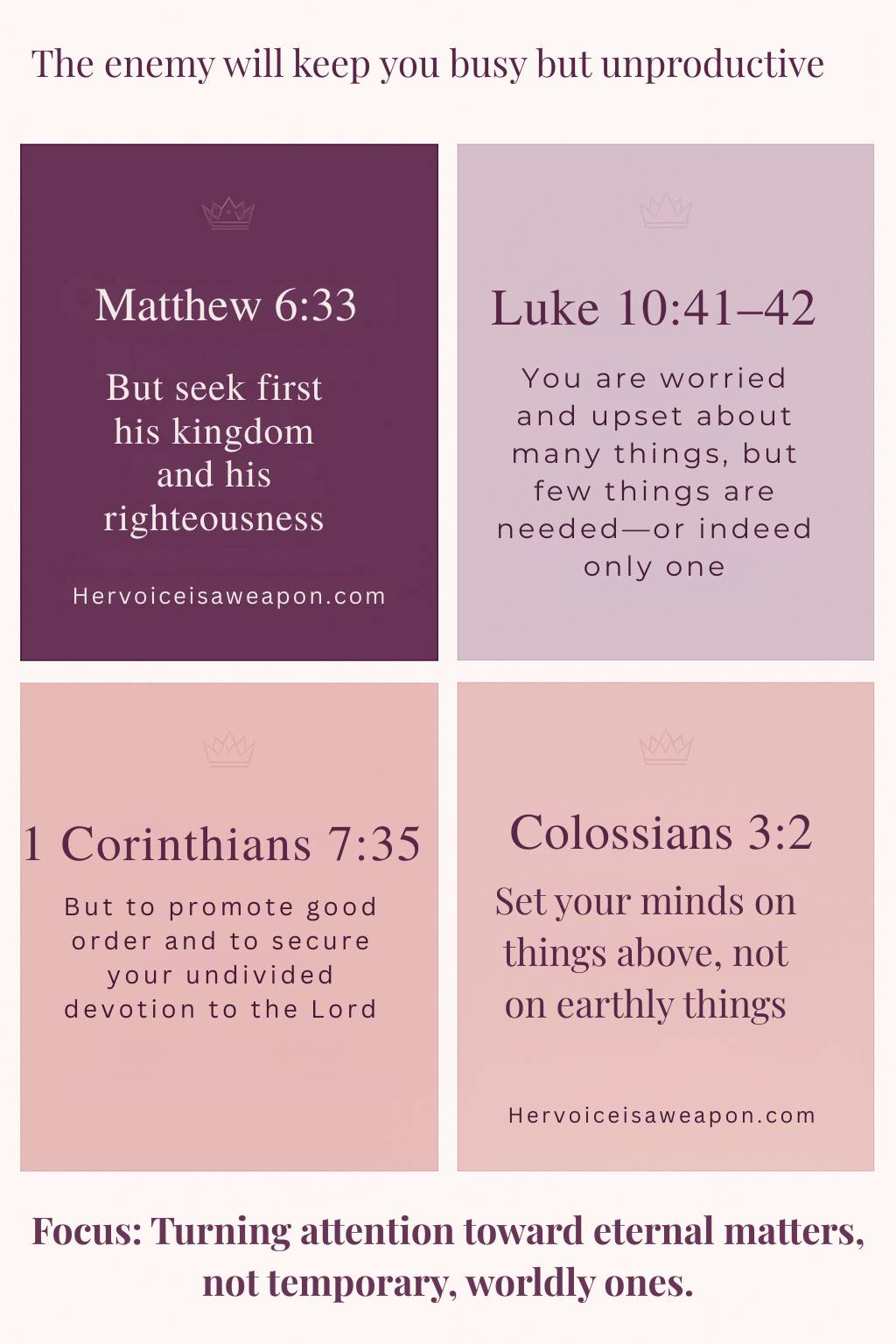 The enemy can make someone feel overwhelmed by the "cares of the world" to keep them from focusing on what truly matters. For every D-I'm going to provide scriptures to add to your spiritual bank account. These verses will encourage you to remain focused on God's purpose.